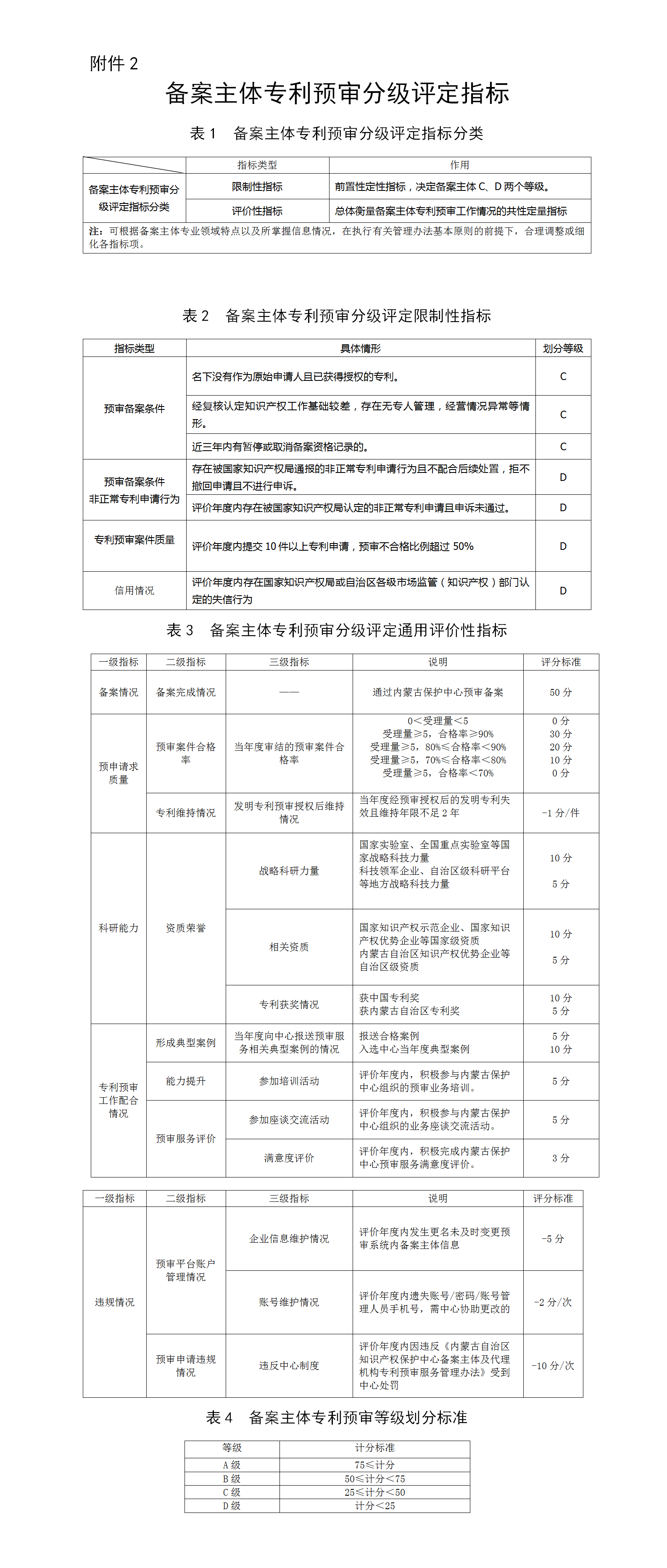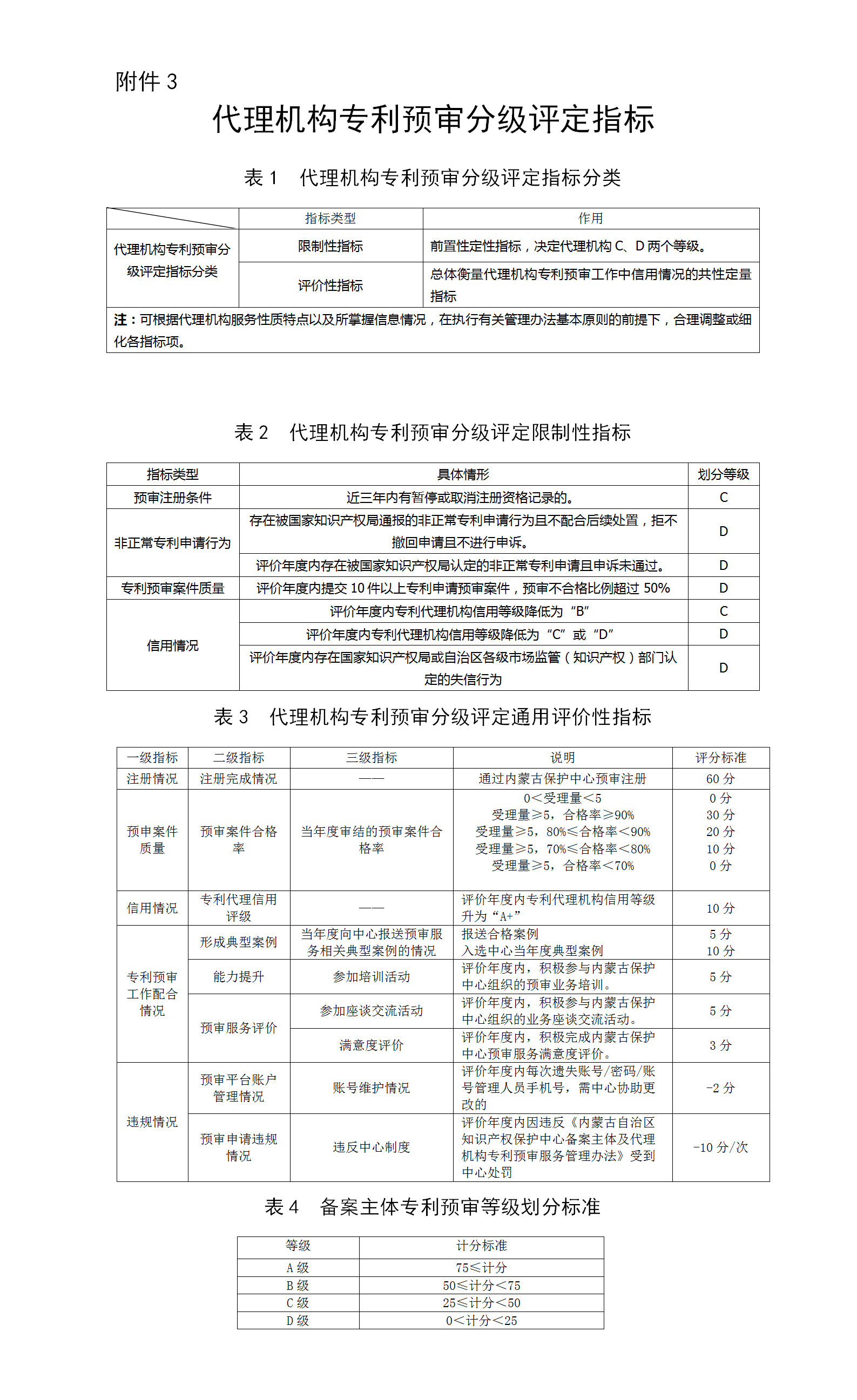 附件:1.内蒙古自治区知识产权保护中心备案主体和代理机构专利预审服务分级分类管理办法(试行)